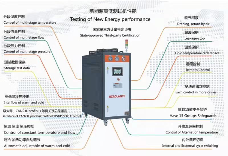 深圳奧蘭特機械開發(fā)的新能源汽車動力電池液冷測試系統(tǒng)、動力電池包深度冷熱沖擊試驗機溫度控制范圍-60~110℃,流量2-100L/min,壓力恒定0~400Kpa;控溫精度:±0.1℃,壓力控制精度±0.1L。控制精度都由國際第三方檢測機構出具證書。